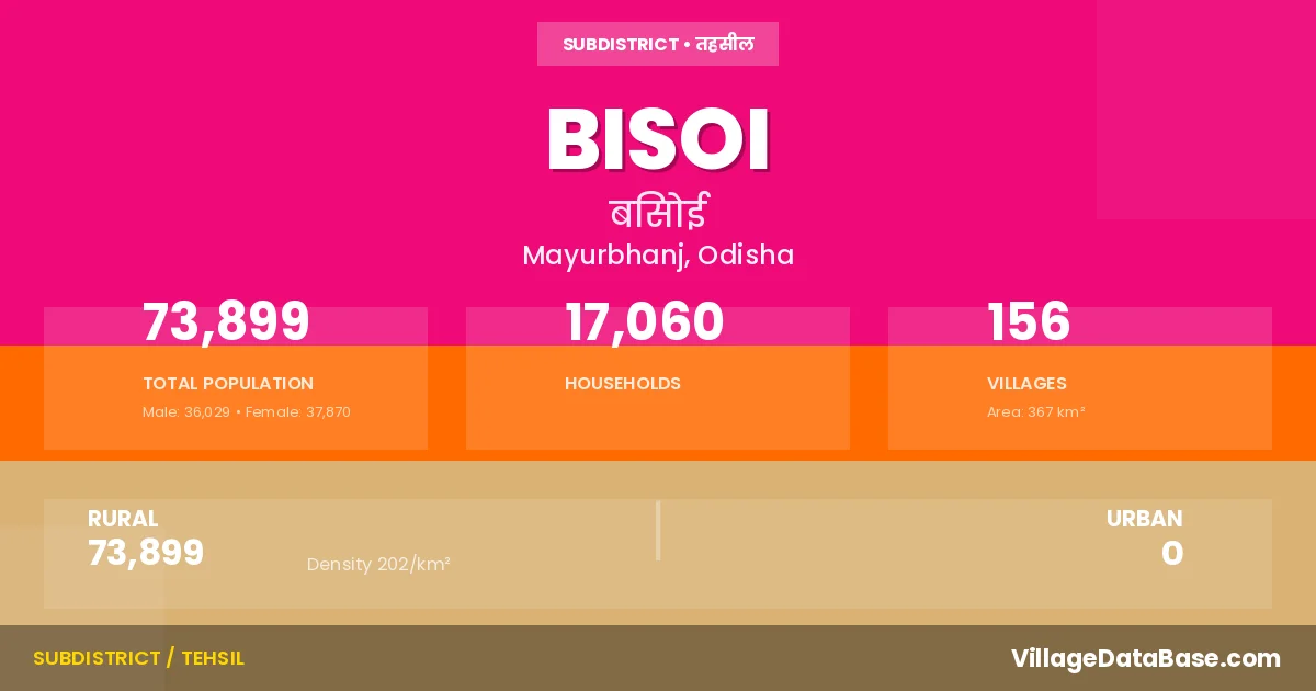 According to the 2011 census The total area of Bisoi Tehsil is 367 km², with a population of 73899 people. The population density is 202 inhabitants per square kilometre, and there are approximately 17060 houses in the sub district.