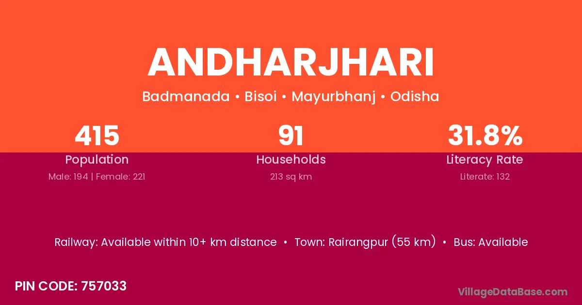 Rairangpur (55 km) is the nearest town to Andharjhari village for major economic activities and is located approximately 55 km away.