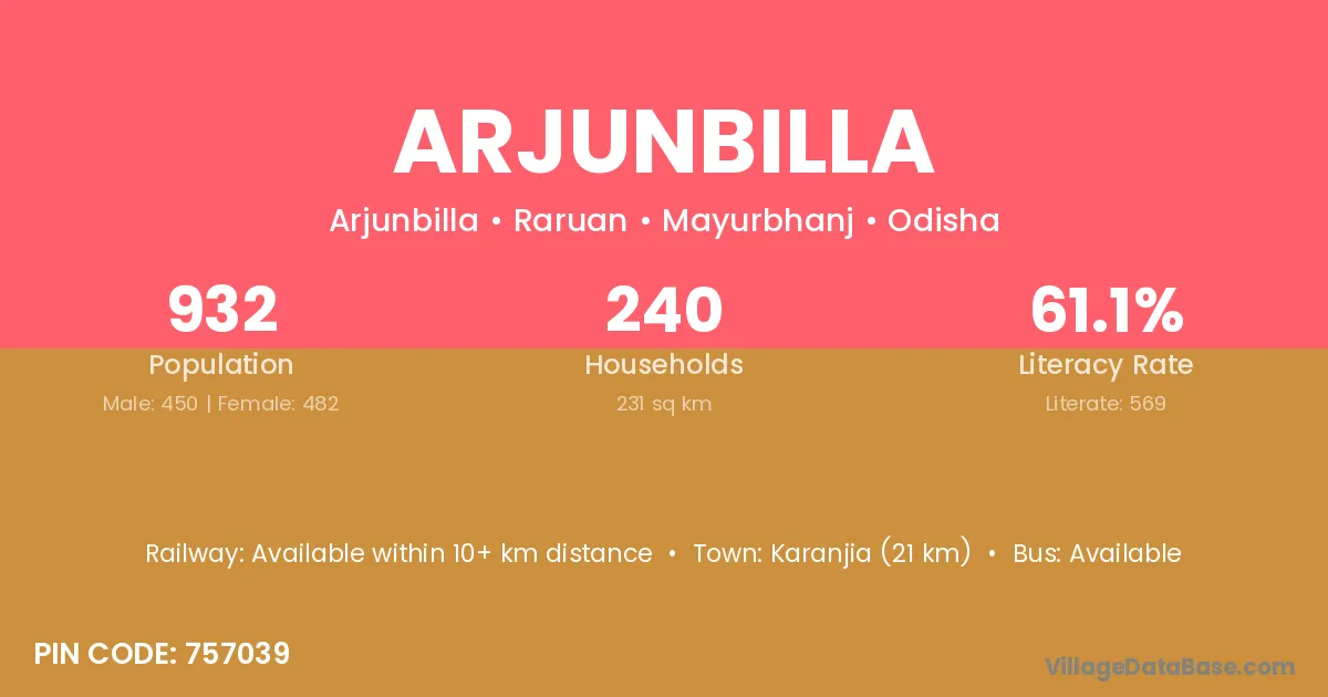 Rairangpur (47 km) is the nearest town to Arjunbilla village for major economic activities and is located approximately 47 km away.