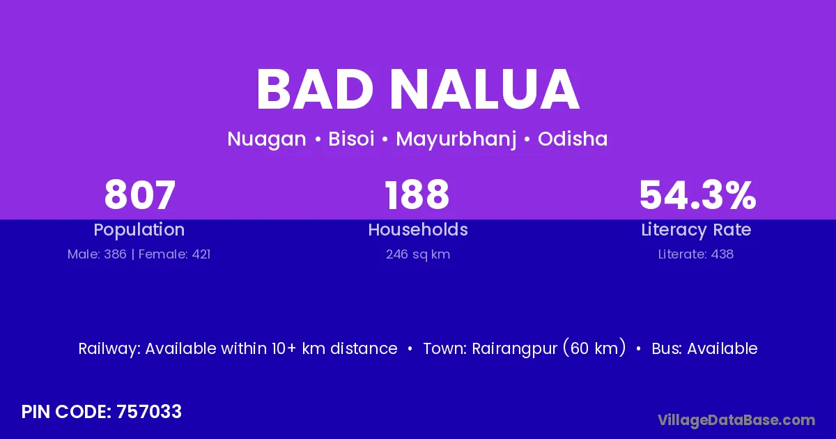 Rairangpur (60 km) is the nearest town to Bad Nalua village for major economic activities and is located approximately 60 km away.