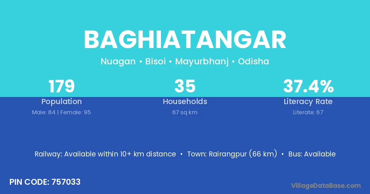 Baghiatangar village has a total population of 179 people, of which 84 are males and 95 are females.