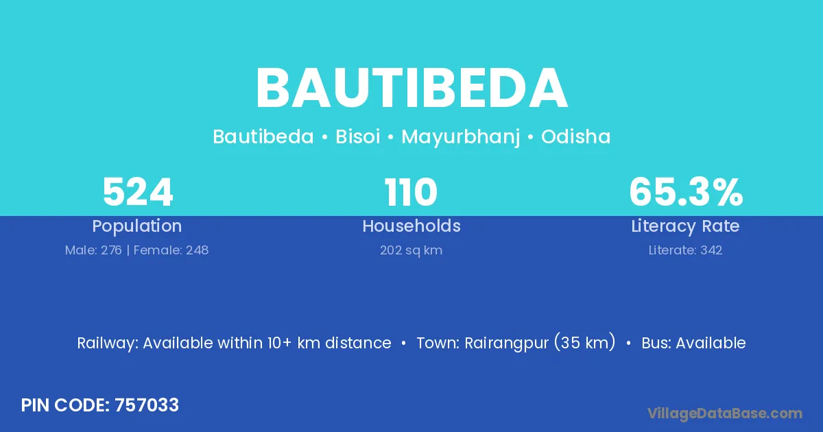 Rairangpur (35 km) is the nearest town to Bautibeda village for major economic activities and is located approximately 35 km away.