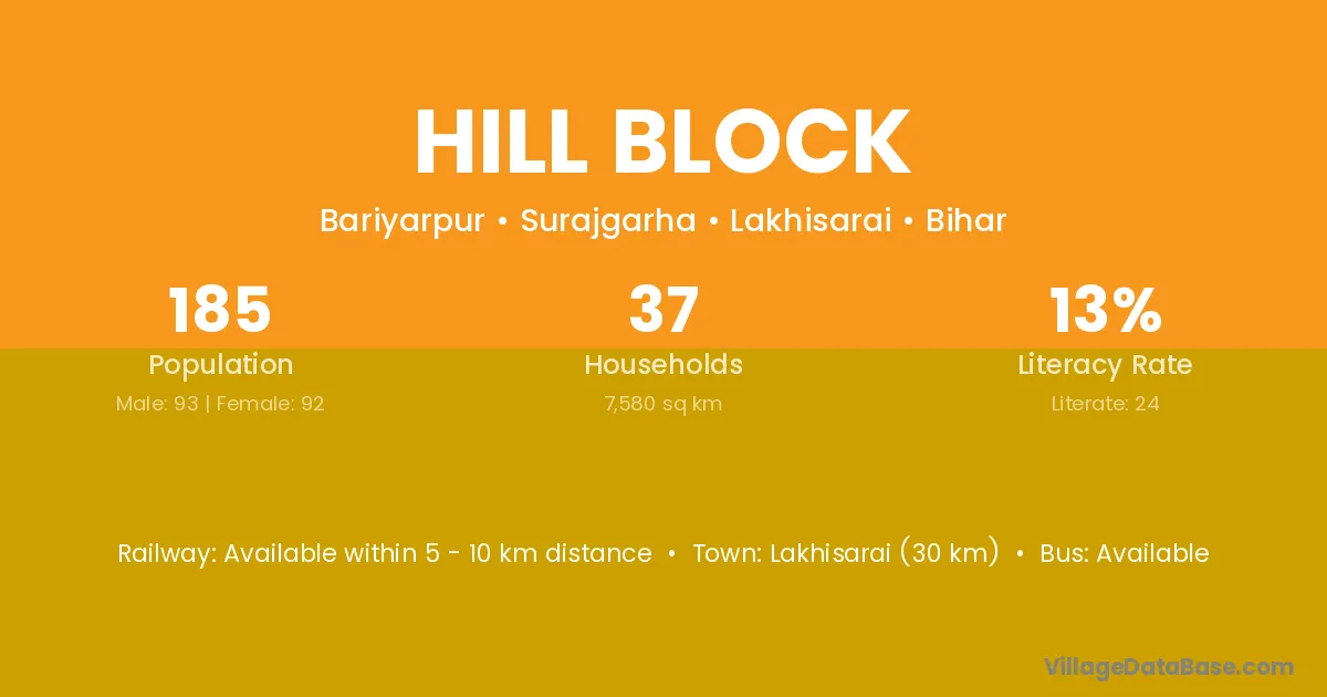 Rairangpur (20 km) is the nearest town to Hill Block village for major economic activities and is located approximately 20 km away.