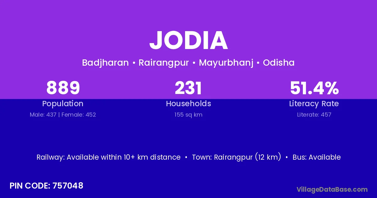 Rairangpur (34 km) is the nearest town to Jodia village for major economic activities and is located approximately 34 km away.