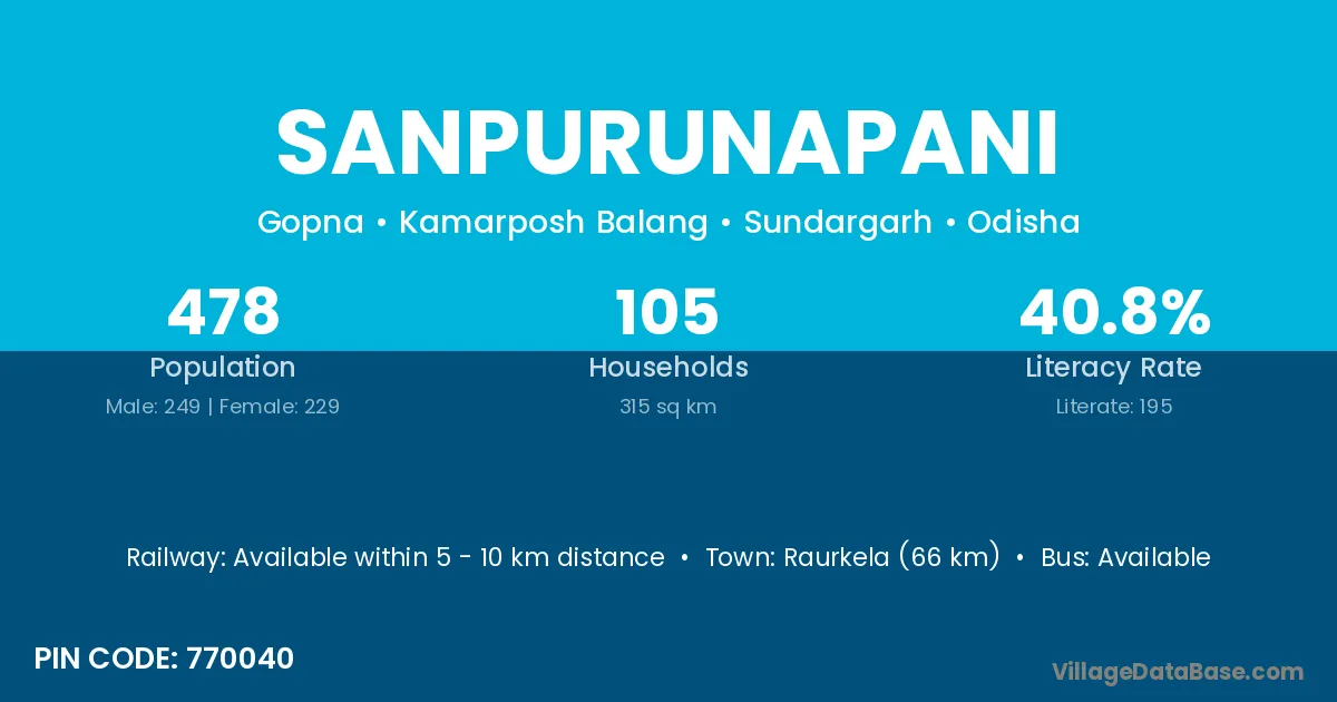 Rairangpur (30 km) is the nearest town to Sanpurunapani village for major economic activities and is located approximately 30 km away.