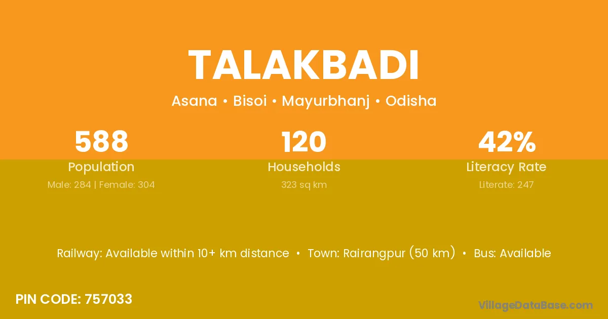Rairangpur (50 km) is the nearest town to Talakbadi village for major economic activities and is located approximately 50 km away.