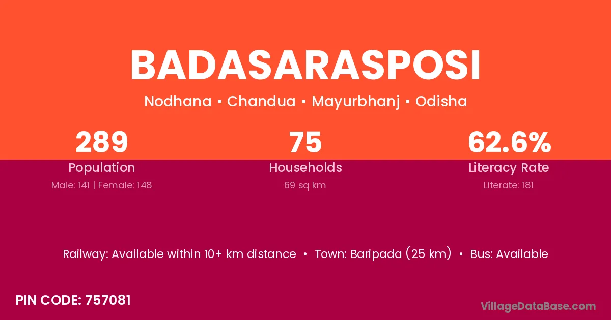 Baripada (25 km) is the nearest town to Badasarasposi village for major economic activities and is located approximately 25 km away.