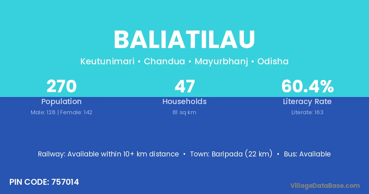 Baripada (22 km) is the nearest town to Baliatilau village for major economic activities and is located approximately 22 km away.