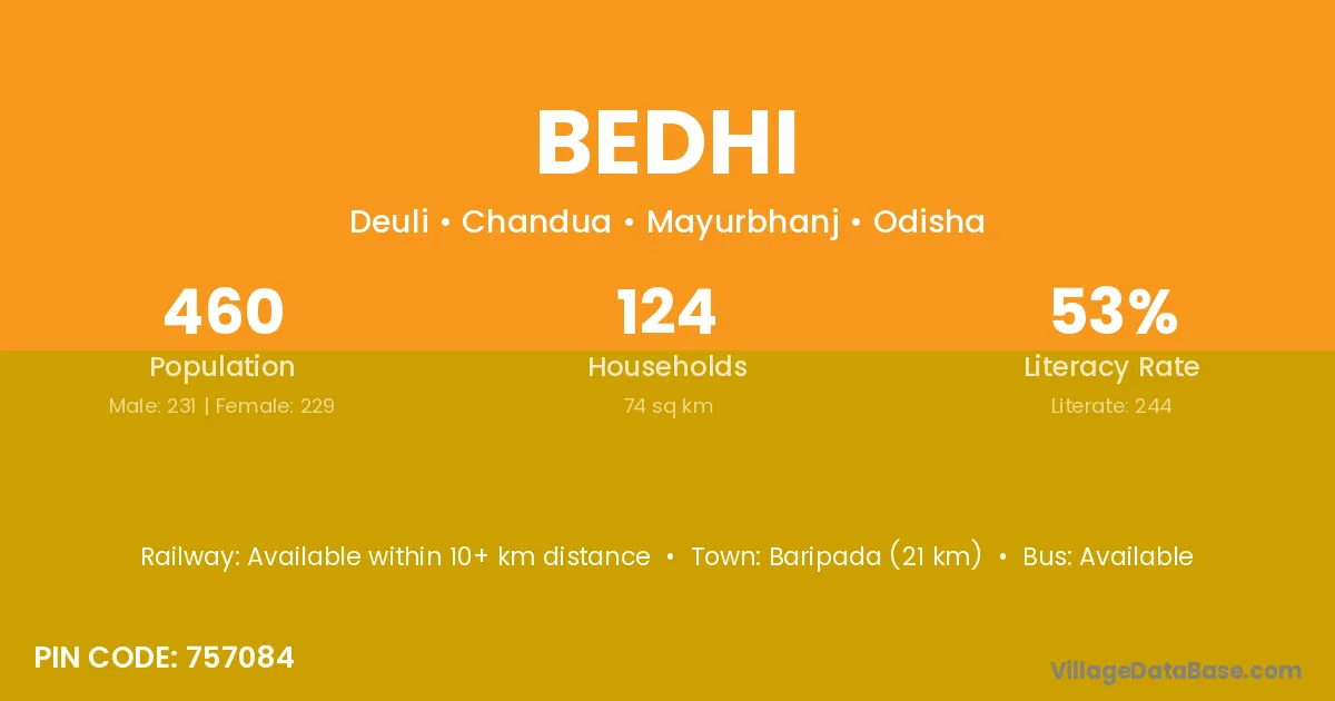 Baripada (21 km) is the nearest town to Bedhi village for major economic activities and is located approximately 21 km away.