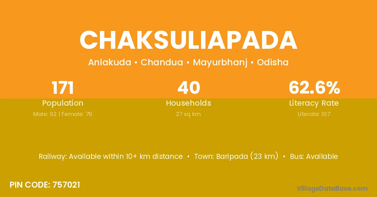 Chaksuliapada village has a total population of 171 people, of which 92 are males and 79 are females.