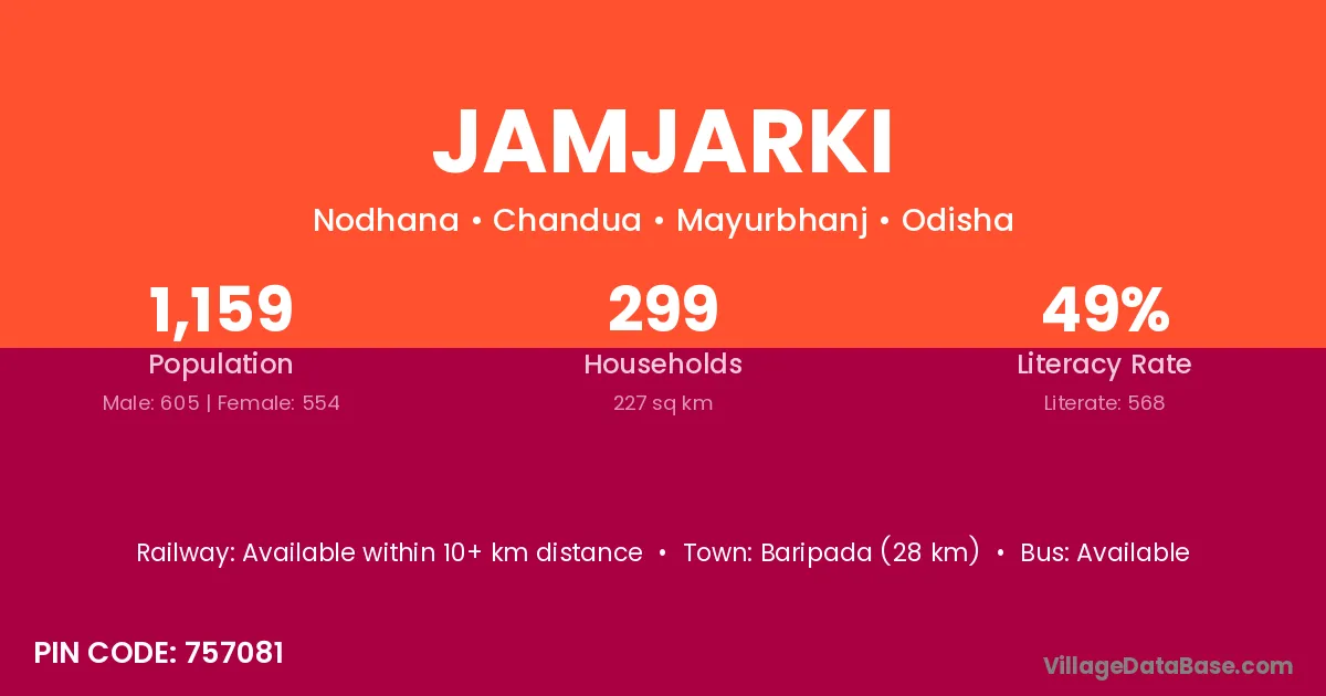 Baripada (28 km) is the nearest town to Jamjarki village for major economic activities and is located approximately 28 km away.