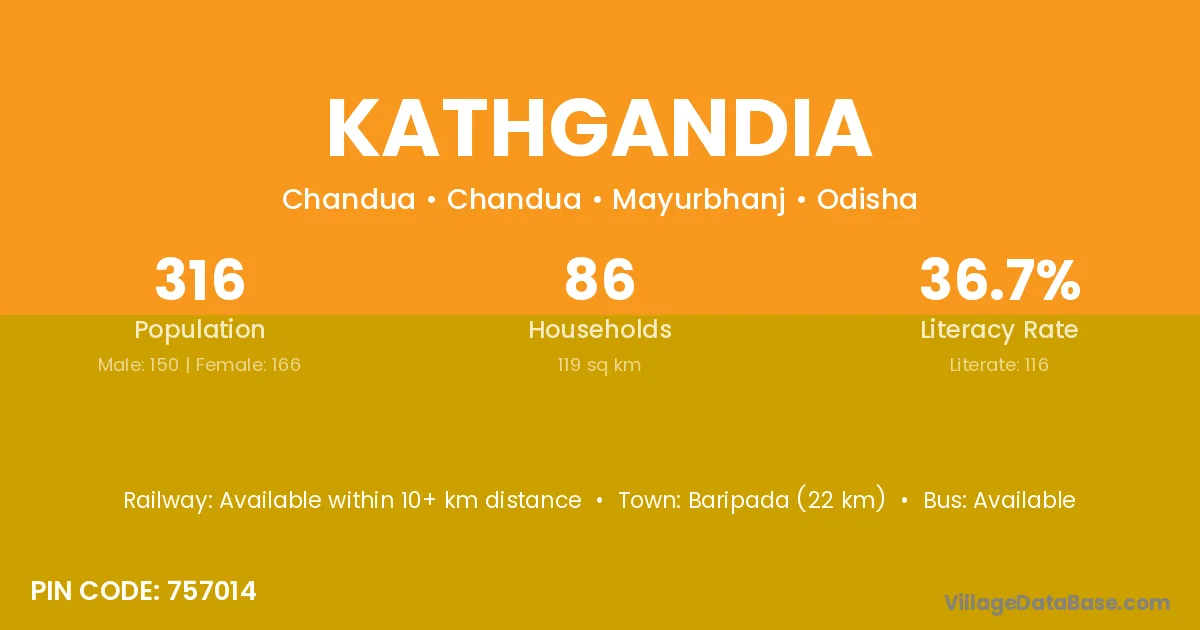 Baripada (22 km) is the nearest town to Kathgandia village for major economic activities and is located approximately 22 km away.