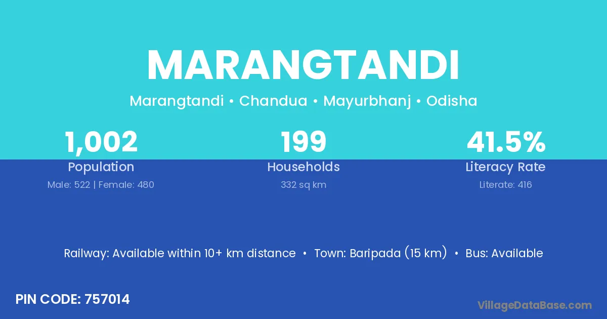 Baripada (15 km) is the nearest town to Marangtandi village for major economic activities and is located approximately 15 km away.