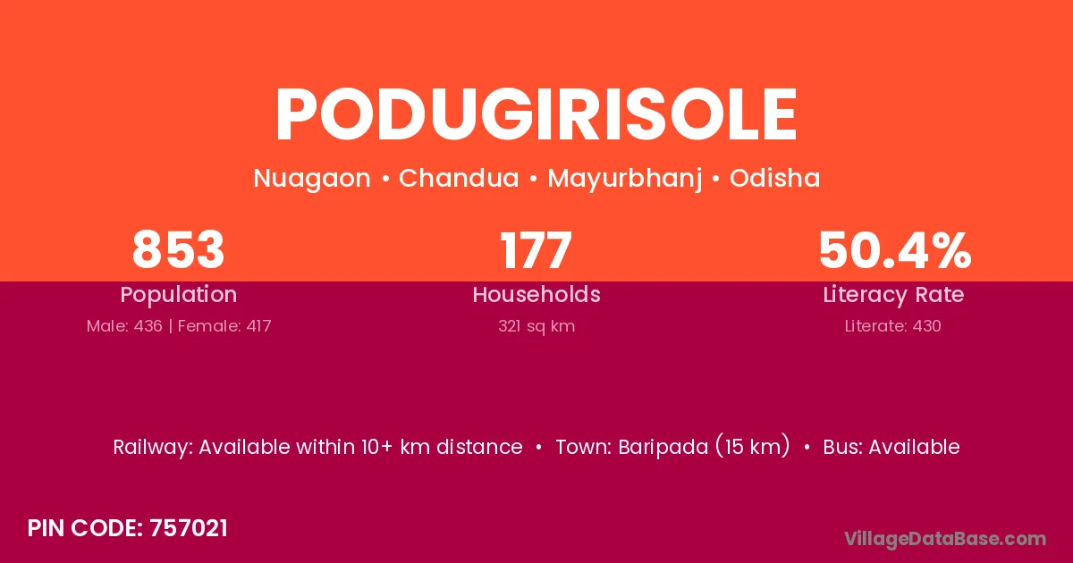 Baripada (15 km) is the nearest town to Podugirisole village for major economic activities and is located approximately 15 km away.