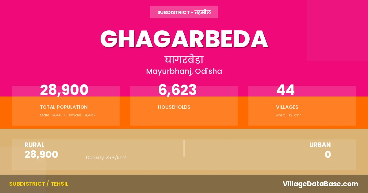 According to the 2011 census The total area of Ghagarbeda Tehsil is 112 km², with a population of 28900 people. The population density is 258 inhabitants per square kilometre, and there are approximately 6623 houses in the sub district.