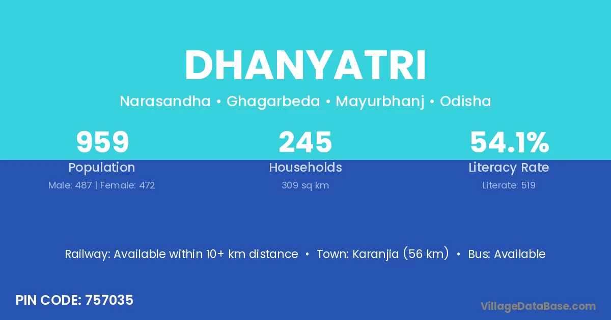 Dhanyatri village has a total population of 959 people, of which 487 are males and 472 are females.