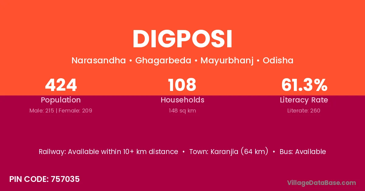 Karanjia (64 km) is the nearest town to Digposi village for major economic activities and is located approximately 64 km away.