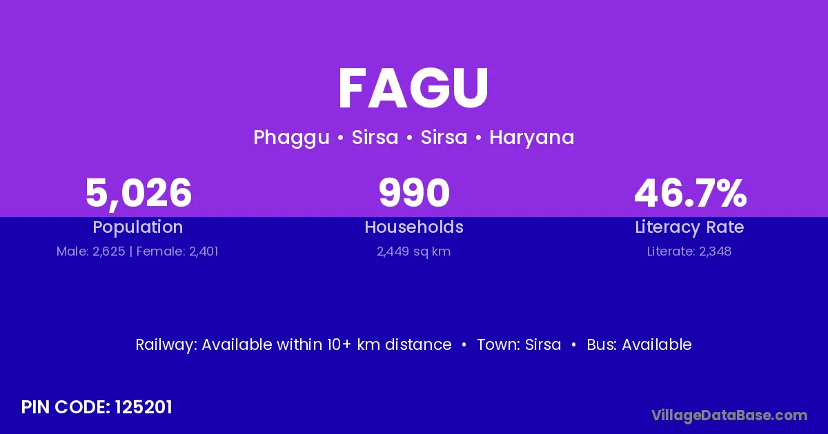 The literacy rate of Fagu village is 41.23%. Male literacy stands at 49.50% and female literacy at 32.39%.