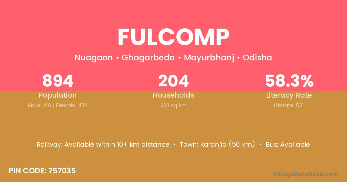 Karanjia (50 km) is the nearest town to Fulcomp village for major economic activities and is located approximately 50 km away.
