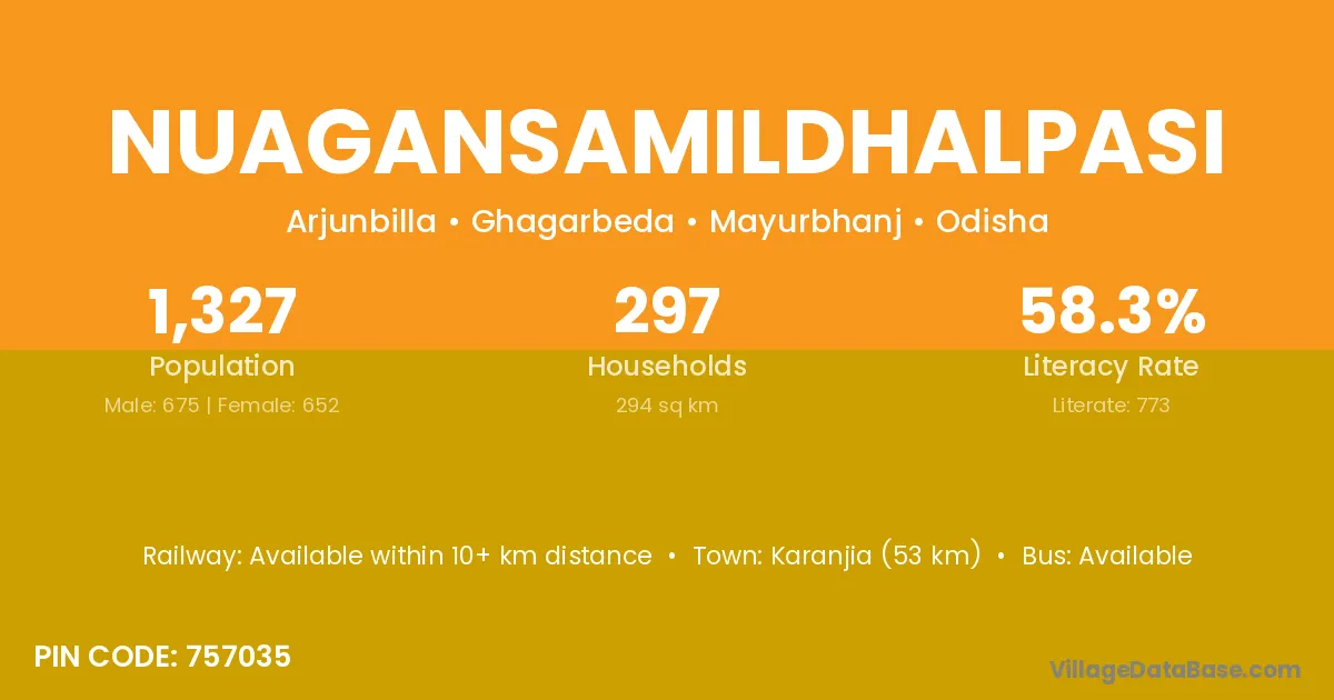 Nuagansamildhalpasi village has a total population of 1,327 people, of which 675 are males and 652 are females.