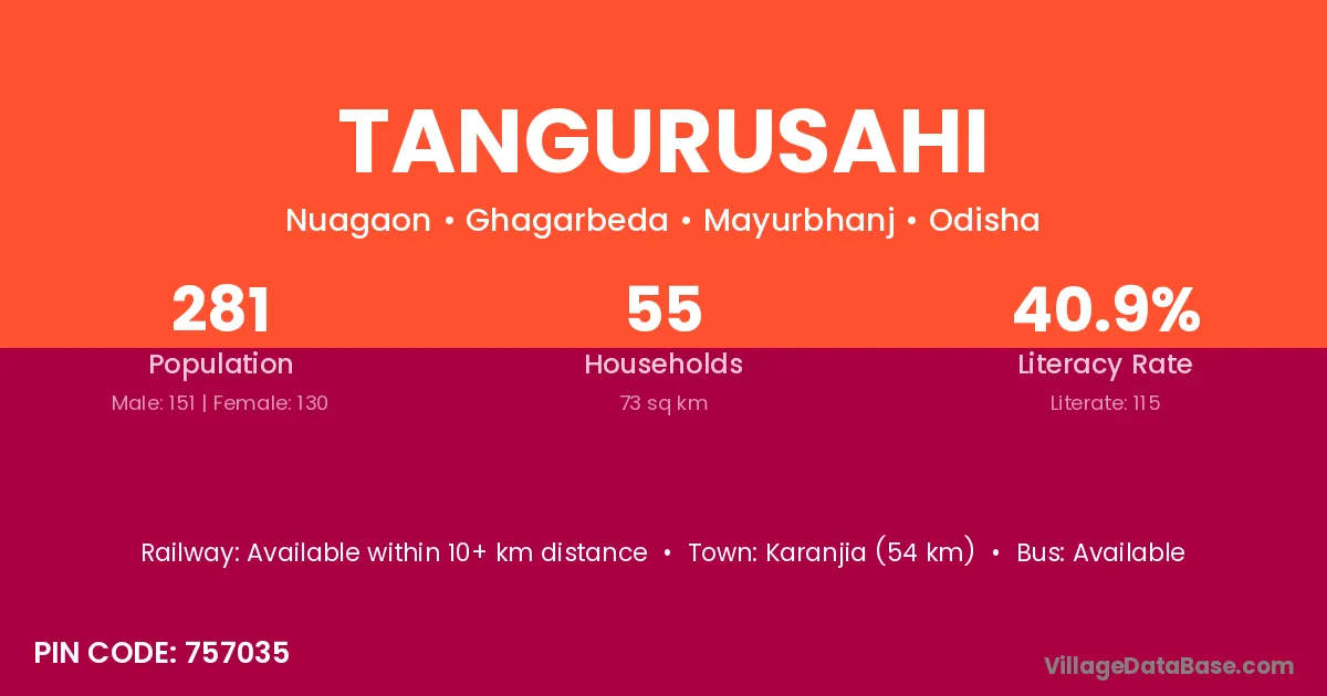 Karanjia (54 km) is the nearest town to Tangurusahi village for major economic activities and is located approximately 54 km away.