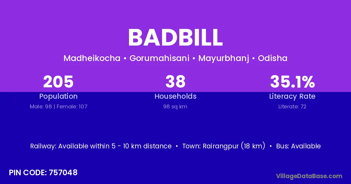 Rairangpur (18 km) is the nearest town to Badbill village for major economic activities and is located approximately 18 km away.