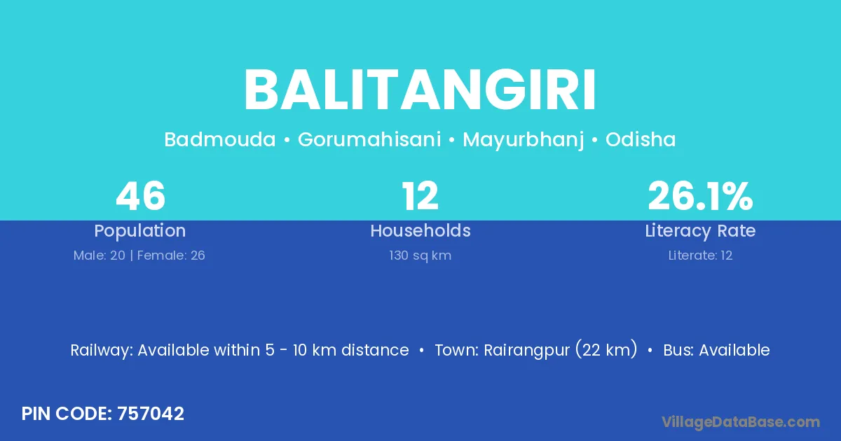 Rairangpur (22 km) is the nearest town to Balitangiri village for major economic activities and is located approximately 22 km away.
