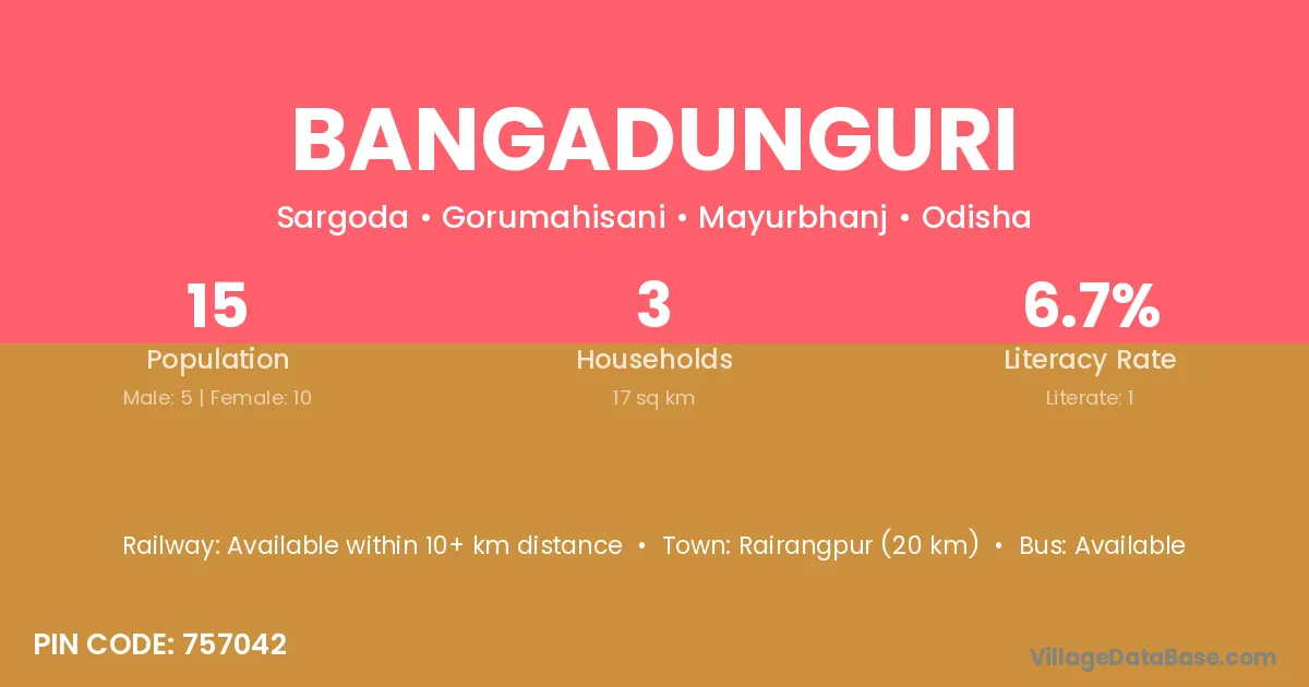 Bangadunguri village has a total population of 15 people, of which 5 are males and 10 are females.