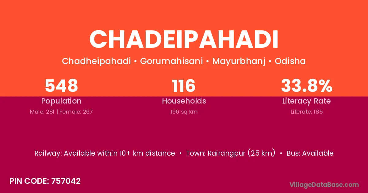 Rairangpur (25 km) is the nearest town to Chadeipahadi village for major economic activities and is located approximately 25 km away.