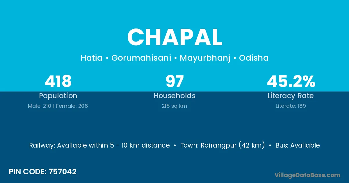 Rairangpur (42 km) is the nearest town to Chapal village for major economic activities and is located approximately 42 km away.