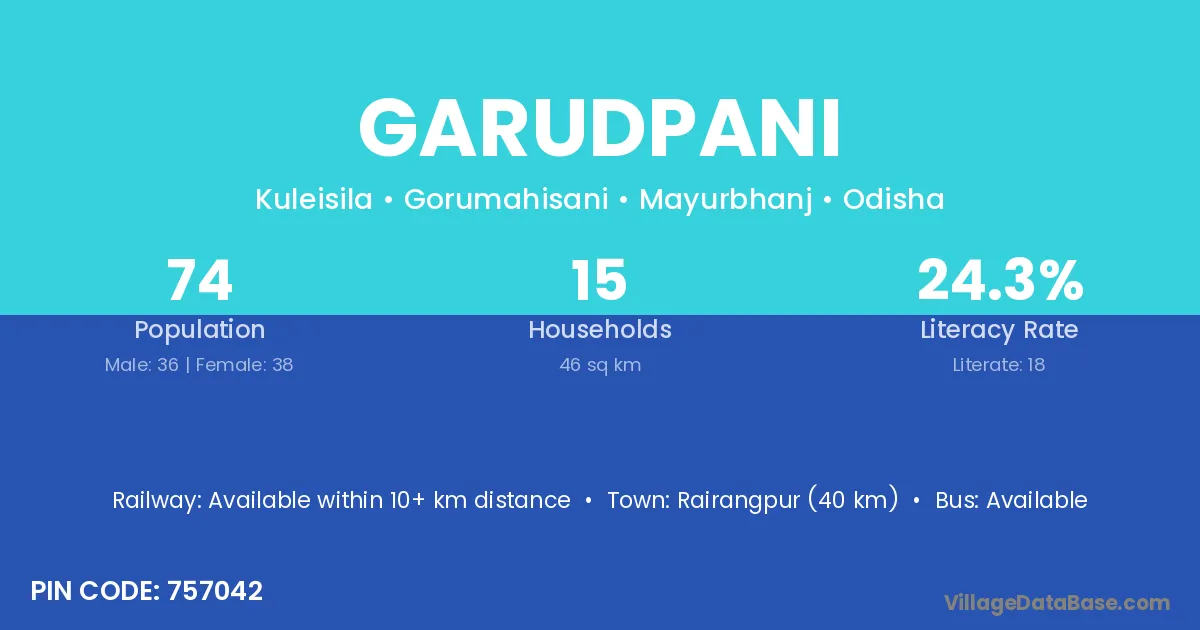 Rairangpur (40 km) is the nearest town to Garudpani village for major economic activities and is located approximately 40 km away.