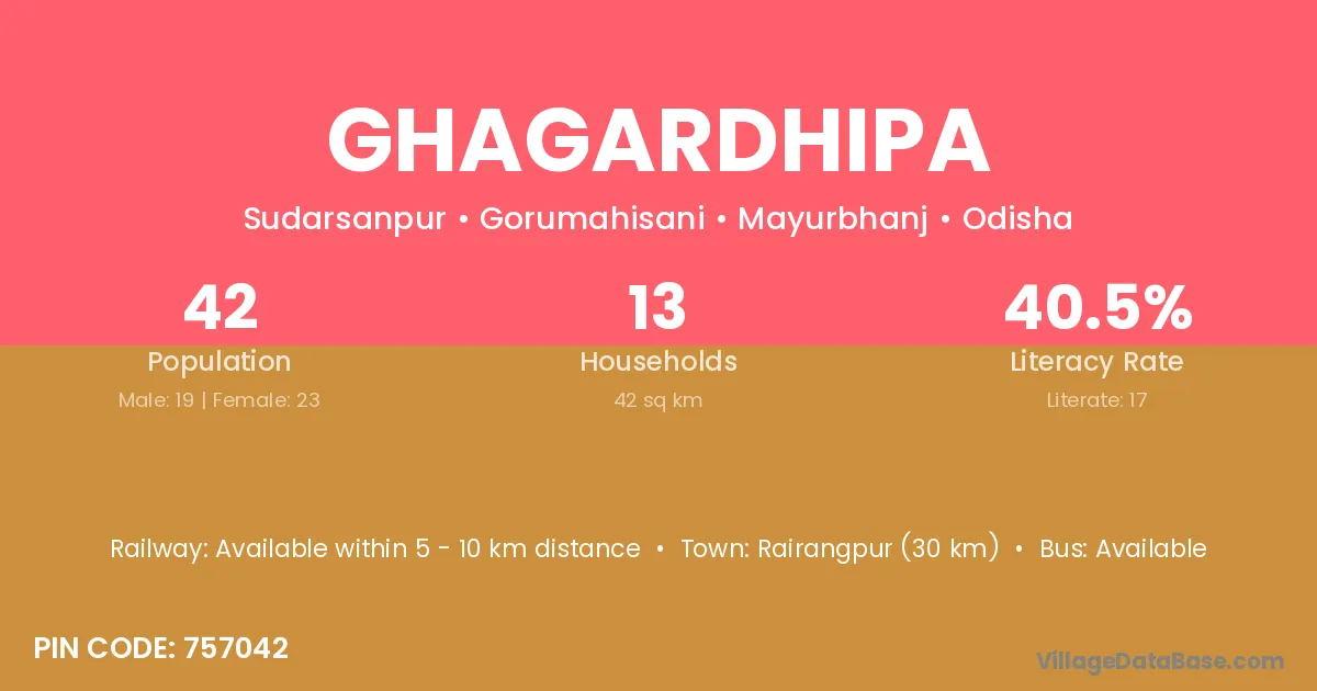 Rairangpur (30 km) is the nearest town to Ghagardhipa village for major economic activities and is located approximately 30 km away.