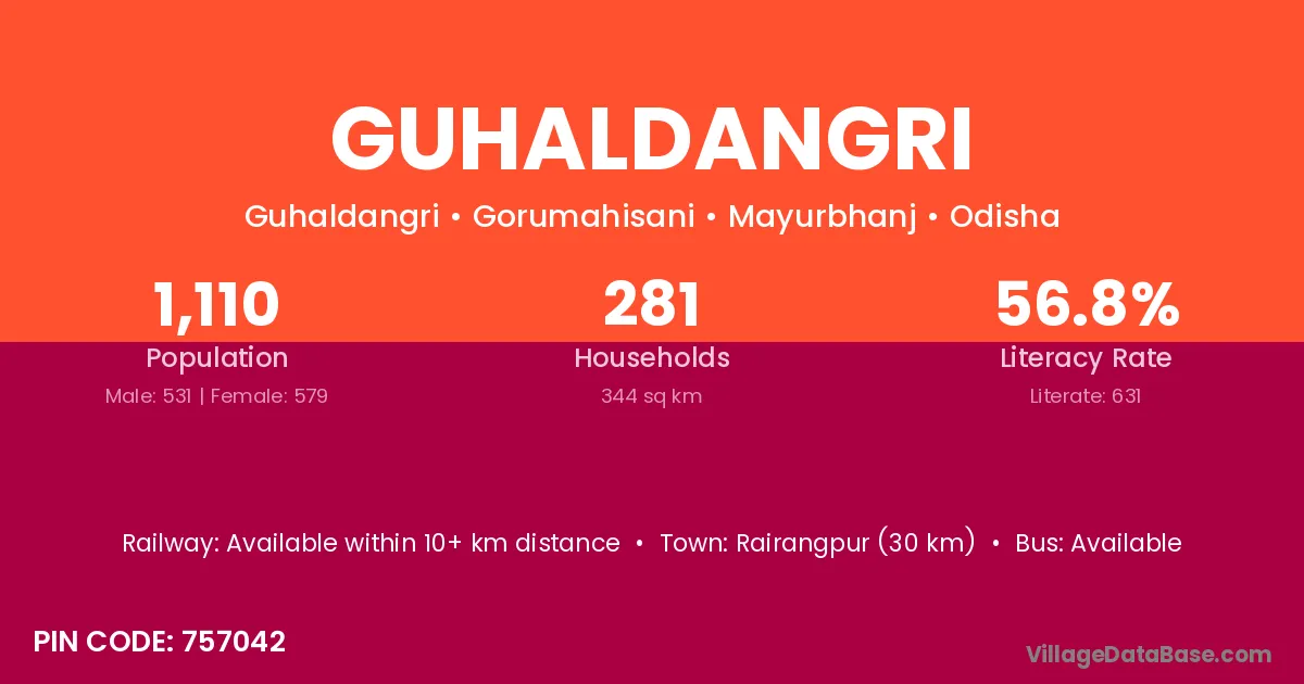 Rairangpur (30 km) is the nearest town to Guhaldangri village for major economic activities and is located approximately 30 km away.