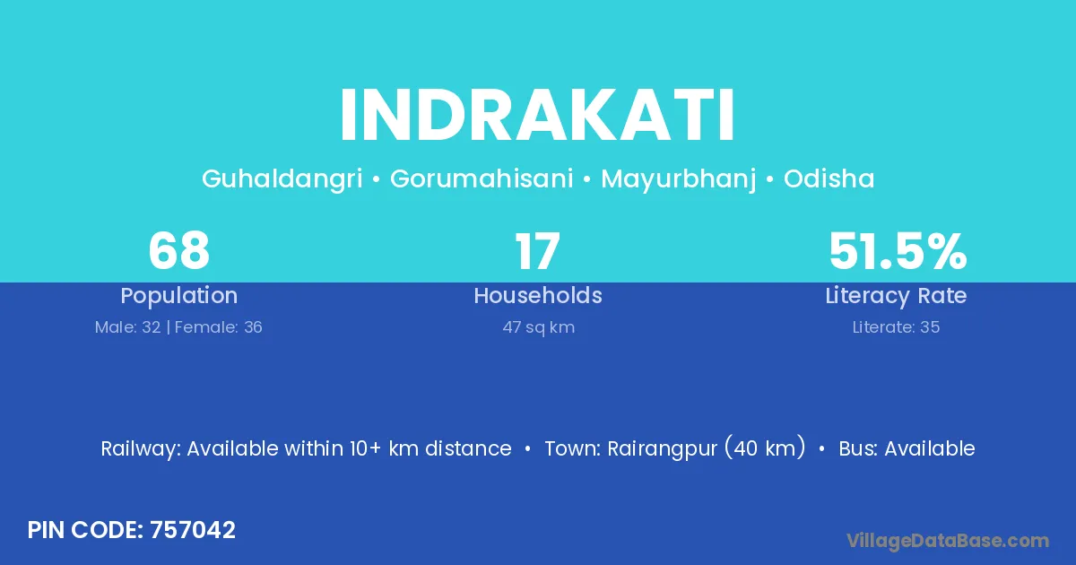 Rairangpur (40 km) is the nearest town to Indrakati village for major economic activities and is located approximately 40 km away.