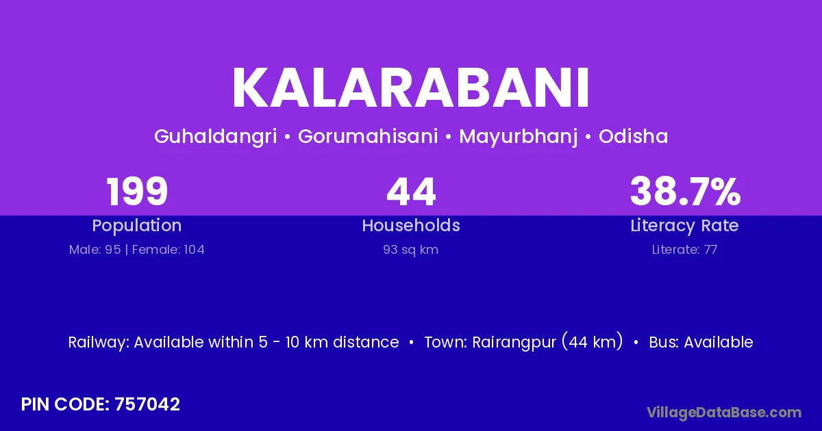 Kalarabani village has a total population of 199 people, of which 95 are males and 104 are females.