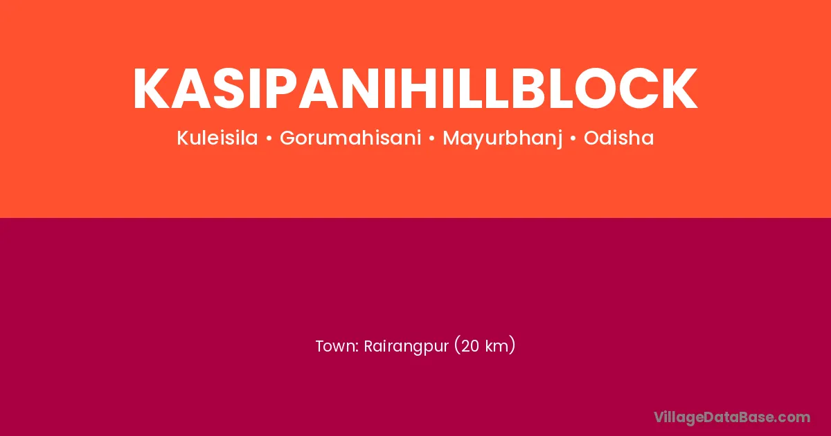 Rairangpur (20 km) is the nearest town to Kasipanihillblock village for major economic activities and is located approximately 20 km away.