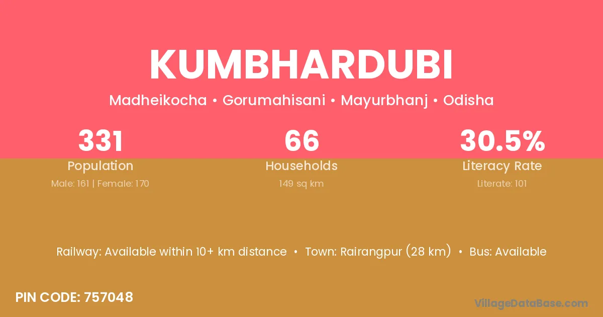 Rairangpur (28 km) is the nearest town to Kumbhardubi village for major economic activities and is located approximately 28 km away.