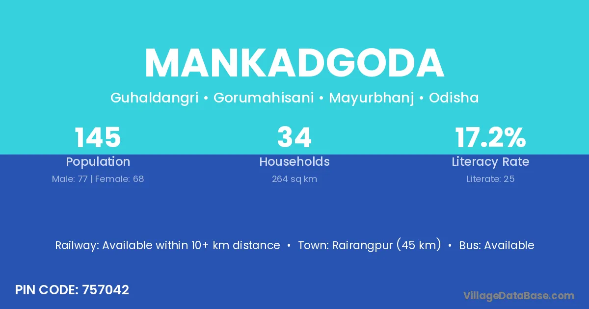 Rairangpur (45 km) is the nearest town to Mankadgoda village for major economic activities and is located approximately 45 km away.