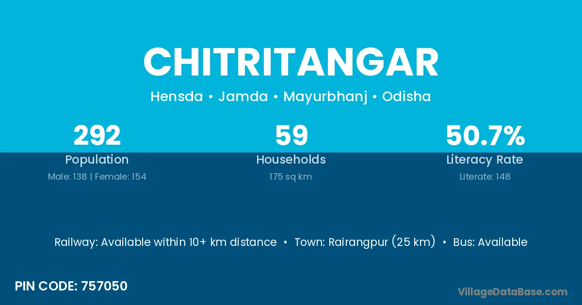 Rairangpur (25 km) is the nearest town to Chitritangar village for major economic activities and is located approximately 25 km away.