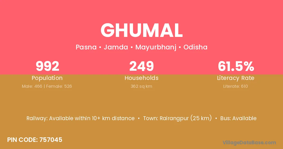 Rairangpur (25 km) is the nearest town to Ghumal village for major economic activities and is located approximately 25 km away.