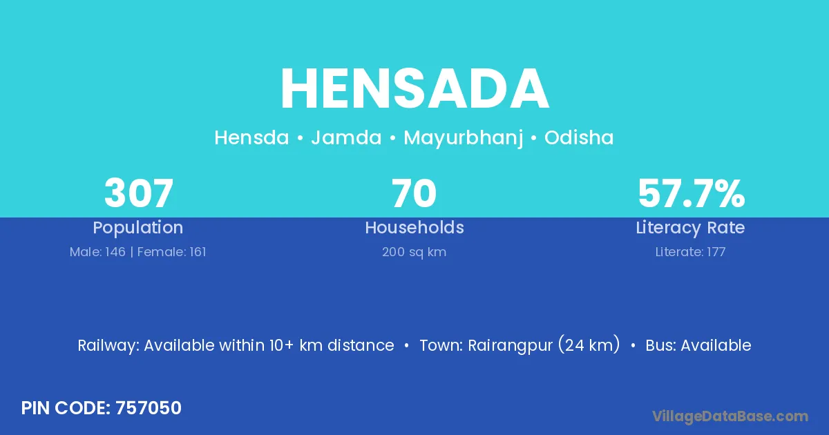 Rairangpur (24 km) is the nearest town to Hensada village for major economic activities and is located approximately 24 km away.