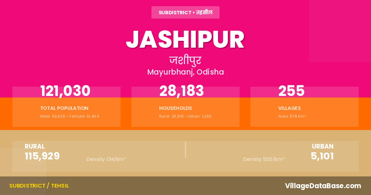 According to the 2011 census The total area of Jashipur Tehsil is 878 km², with a population of 121030 people. The population density is 138 inhabitants per square kilometre, and there are approximately 28183 houses in the sub district.