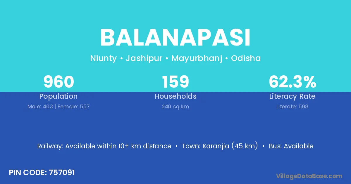 Karanjia (45 km) is the nearest town to Balanapasi village for major economic activities and is located approximately 45 km away.