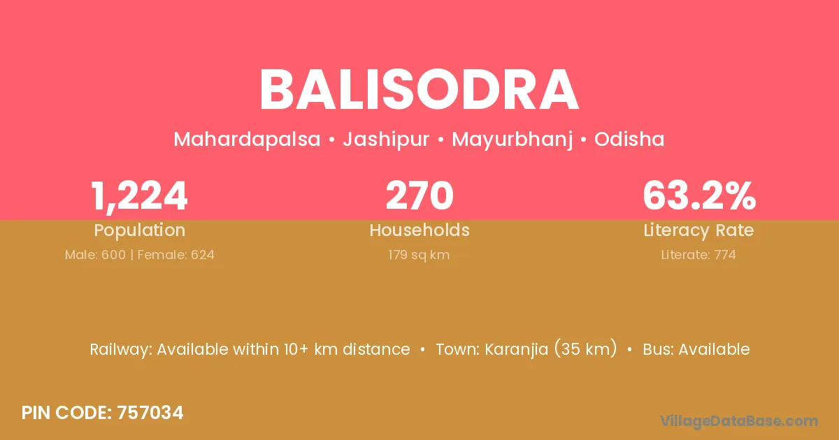 Karanjia (35 km) is the nearest town to Balisodra village for major economic activities and is located approximately 35 km away.