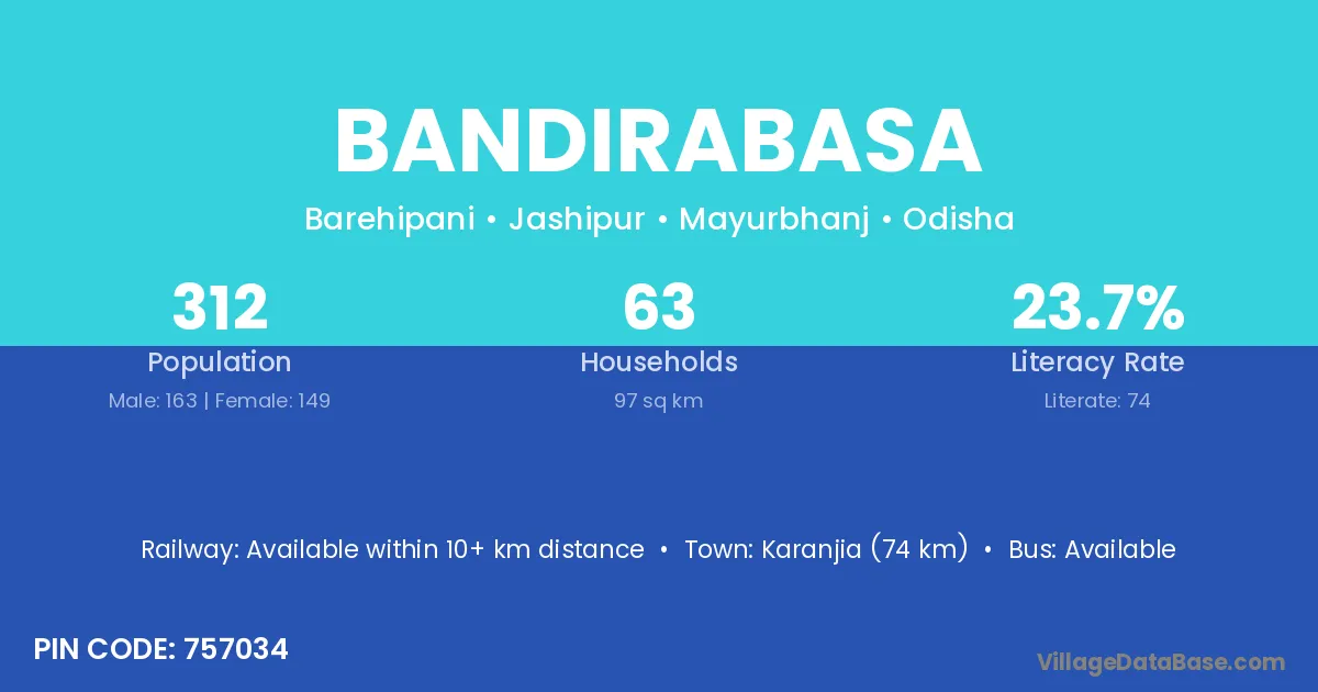 Karanjia (74 km) is the nearest town to Bandirabasa village for major economic activities and is located approximately 74 km away.
