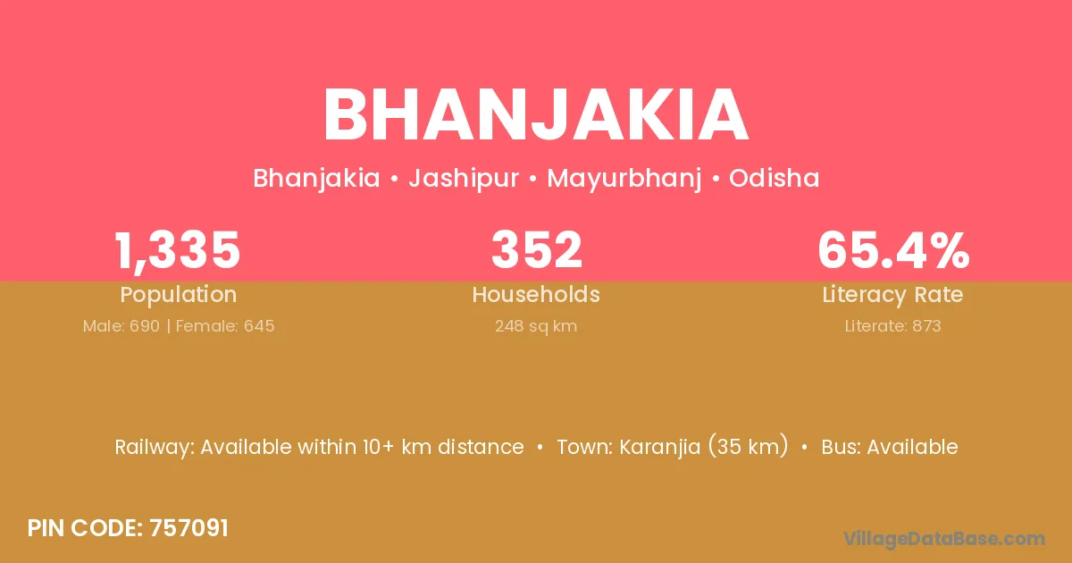 Karanjia (35 km) is the nearest town to Bhanjakia village for major economic activities and is located approximately 35 km away.