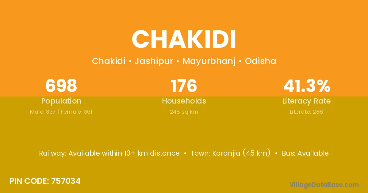 Karanjia (45 km) is the nearest town to Chakidi village for major economic activities and is located approximately 45 km away.