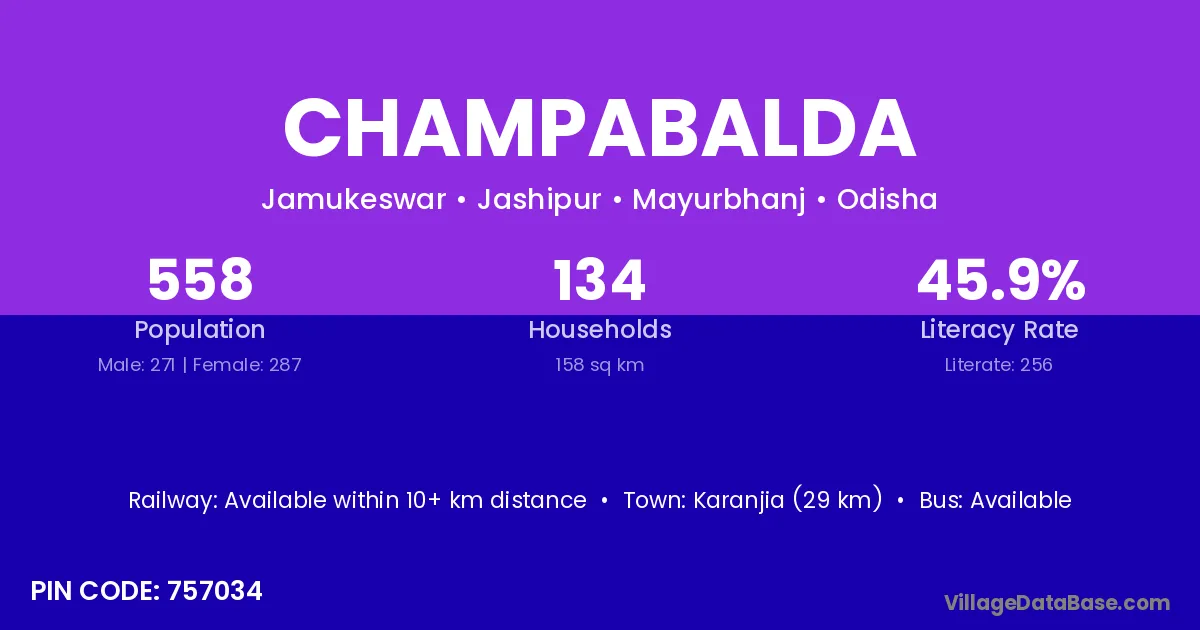 Karanjia (29 km) is the nearest town to Champabalda village for major economic activities and is located approximately 29 km away.