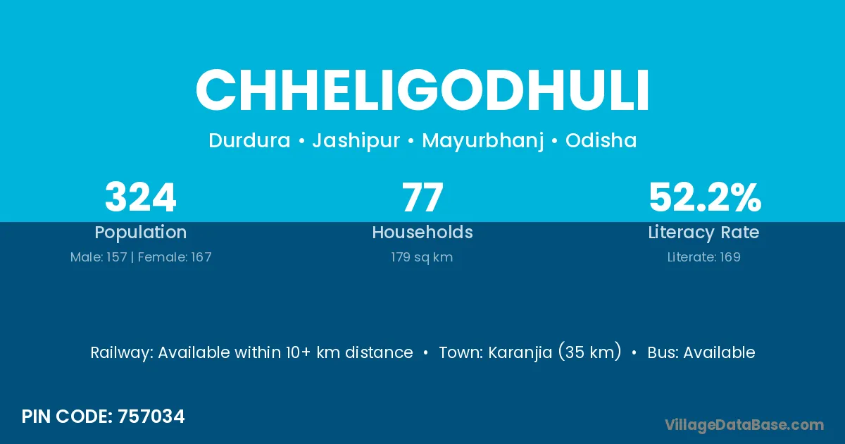 Karanjia (35 km) is the nearest town to Chheligodhuli village for major economic activities and is located approximately 35 km away.