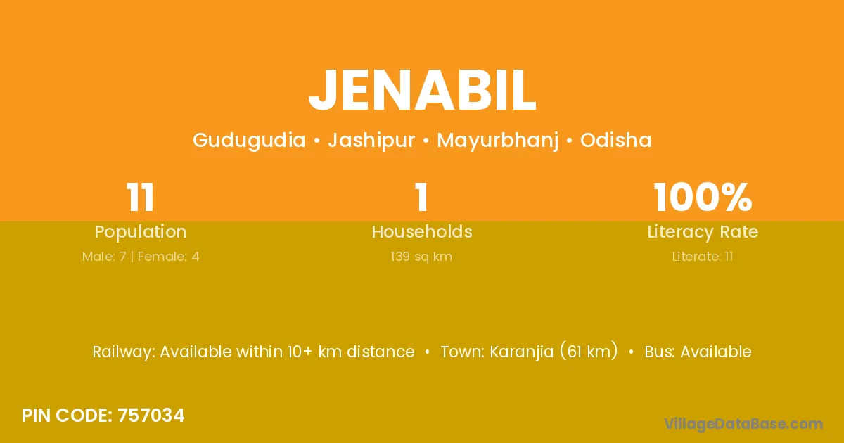 Karanjia (61 km) is the nearest town to Jenabil village for major economic activities and is located approximately 61 km away.